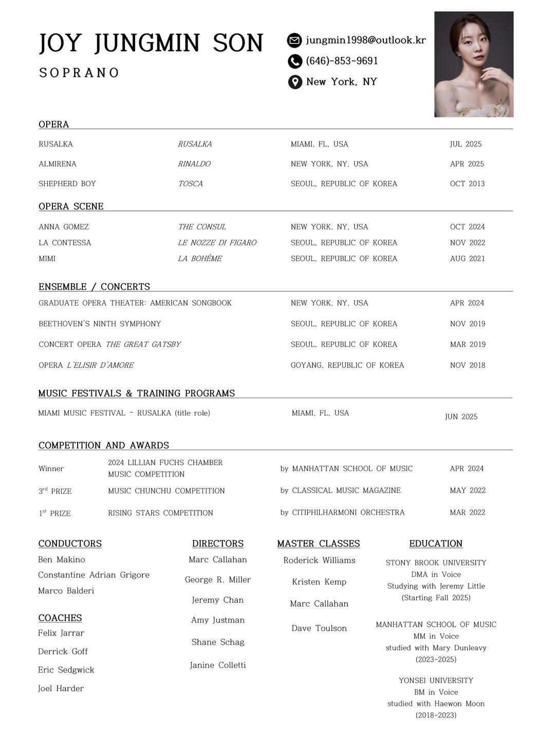Joy Jungmin Son is an operatic soprano and a native of South Korea, currently based in New York. She is pursuing her Doctor of Musical Arts (DMA) degree in Voice at Stony Brook University under the mentorship of Jeremy Little.She previously earned her Master of Music degree in Vocal Performance at the Manhattan School of Music, where she studied with Mary Dunleavy. She completed her Bachelor of Music degree at Yonsei University.Jungmin has portrayed roles such as La Contessa (Le Nozze di Figaro), Mimì (La Bohème), and Anna Gomez (The Consul), and made her operatic debut as the Shepherd Boy in Tosca under the baton of Marco Balderi. In the 2024–2025 season, she performed as Almirena in Handel’s Rinaldo at the Manhattan School of Music (April 2025) and portrayed the title role of Rusalka in Dvořák’s Rusalka at the 2025 Miami Music Festival, conducted by Ben Makino.Additionally, Jungmin was selected as a soloist singer for the Independence Day concert held on July 4th, 2025, at the Miami Music Festival Ocean Drive event, performing before an audience of several hundred attendees.